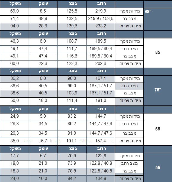 תקן VESA (בס"מ): 40×60 (דגם 98") – 40×40 (דגם 85") – 30X30(דגמי 75", 65", 55")